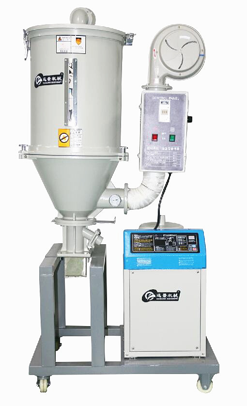 料斗式干燥器是热风干燥的另一种形式,其工作原理是将物料装于料斗,鼓风机将加热风管中热空气吹入料斗,经过物料存积区域后从排气口排出。由于流动空气的温度高出物料温度几十摄氏度,借温差的作用促使物料除湿。除湿后物料可进入注塑机或挤出机的料筒中。